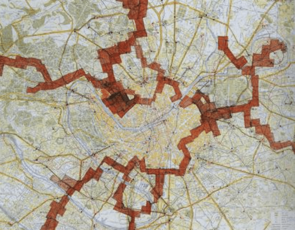 Debord was interested in the nature of the spaces in between the state or civic territories, realising space no-one possesses – the sea, deserts, wasteland, spaces of pure communication, manifesting in The Naked City (1957)31 a psychogeographic map for Paris that made connections and inscribed a territory over the top of that created by the city administration. By erasing the masters or hosts of a city in this way psychogeography makes another kind of citizenship imaginable: both as re-inscribing the general as a particular ‘City of Refuge’ within, and if conceptually extended to the global beyond nation states, as a cosmopolitan world citizenship. New Babylon’s strategy is to extend the public matter of Kant’s Republic so only the foreign remains, there is no inside from which to exclude the stranger.