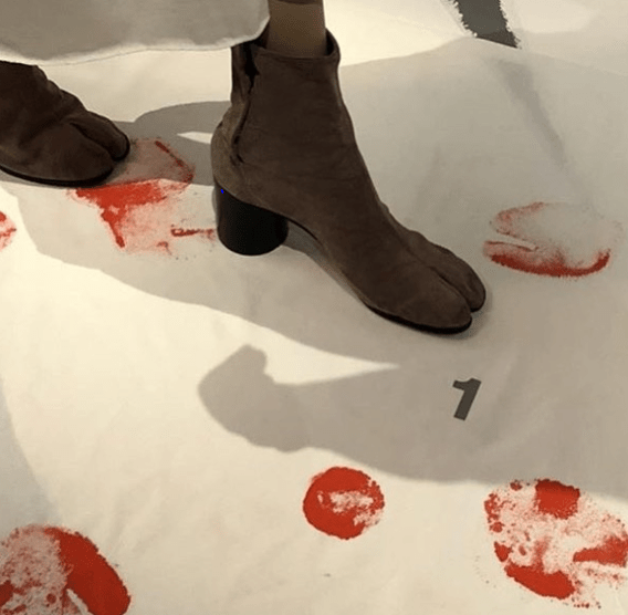 Nevertheless Margiela’s clothes do seem to speak somehow of their location. They have the tone of revelation, as if they have their own history or a story to tell about the wearer. For the ‘Doll’s Wardrobe’ collection (FW94/95) he re-presented dolls clothes that had been real clothes scaled down to dolls sizes, then brought back up to human proportions retaining the outsize zips and awkward proportions. At once figured as palimpsests, the exposed and defective tailoring brought the insides of a garment out, bearing the traces of other ways of being. And the vertiginous scales made them uncanny objects, creepy. Clothes like this that were both beautiful and analytical beg the question: what is it that these clothes speak about? Despite the conspicuously skilful tailoring and luxurious materials the inspired constructions displayed in the Galleria exhibition, like the dolls clothes, all feel shadowed or off-balance in some way. Margiela’s well known appropriation of the Japanese tabi shoe reveals what is at stake. As it migrates from an ethnic reference, a theatrical kawaii to a cloven hoof that leaves bloodied footprints across the floor of his shops, it demands acknowledgement of the entanglements in fashion of beings both human and non-human. Garments clothe and protect but fashion signifies the wearer’s cultural location. Margiela’s mode parlante talks about how clothes are totemic, become fetishised immaterial commodities invested with the intimacies and sentiments that substitute for those that are absent.