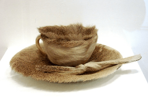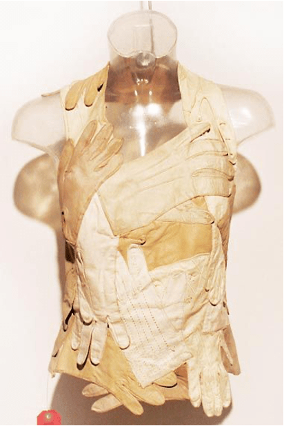 Margiela operates less as an auteur-designer but more as kind of keeper or curator of clothes. He presents vetements-trouves in a surrealist manner. That totems, transitional and fetish objects are traditionally animal is not lost to Margiela. His sophisticated implication of recycled luxury leather goods polished with use echoes Sigmund Freud’s ‘shine on the nose’, conjuring a glistening fetish commodity from the traces of abject body fragments. Freud’s deliciously nutty case study of fetish analyses how a bilingual young man’s desire for shiny noses ameliorates his fear of castration as he associates the German for shine, ‘glanz’, with the English ‘glans’, and an object of fear is transformed into an object of desire. A halter top made of second hand gloves jars much in the same way the surrealist artist Meret Oppenheim’s Object in Fur (1936) might: