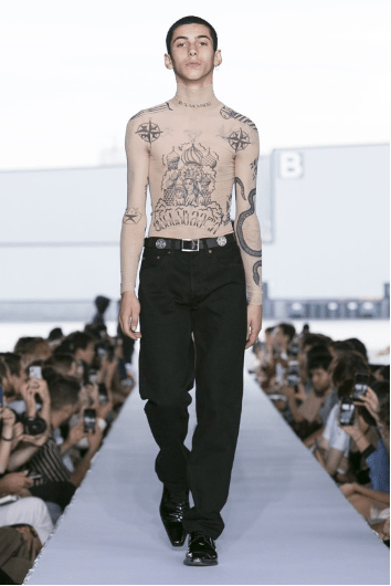 Top: Russian tattoo t-shirt from Vetements SS19 show, Paris, July 3rd 2018. Bottom:A Hermes print that should be found on a silk scarf or tie becomes luxury tribal skin marking. Margiela for Hermes 1997.